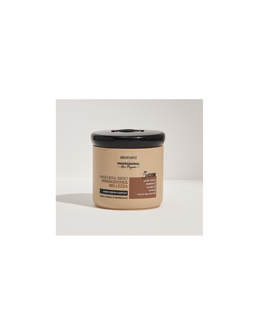 La Maschera Riparazione & Bellezza con 5 Azioni dona nuova vitalità e benessere ai capelli fragili e danneggiati, per un risultato professionale direttamente a casa tua.