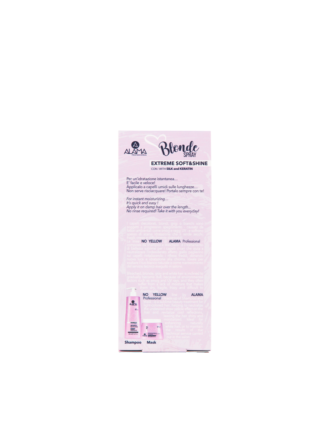 Alama No-Yellow Extreme Soft & Shine svolge un'azione nutriente, ristrutturante ed districante. Contrasta inoltre i riflessi gialli indesiderati per un biondo puro e brillante.