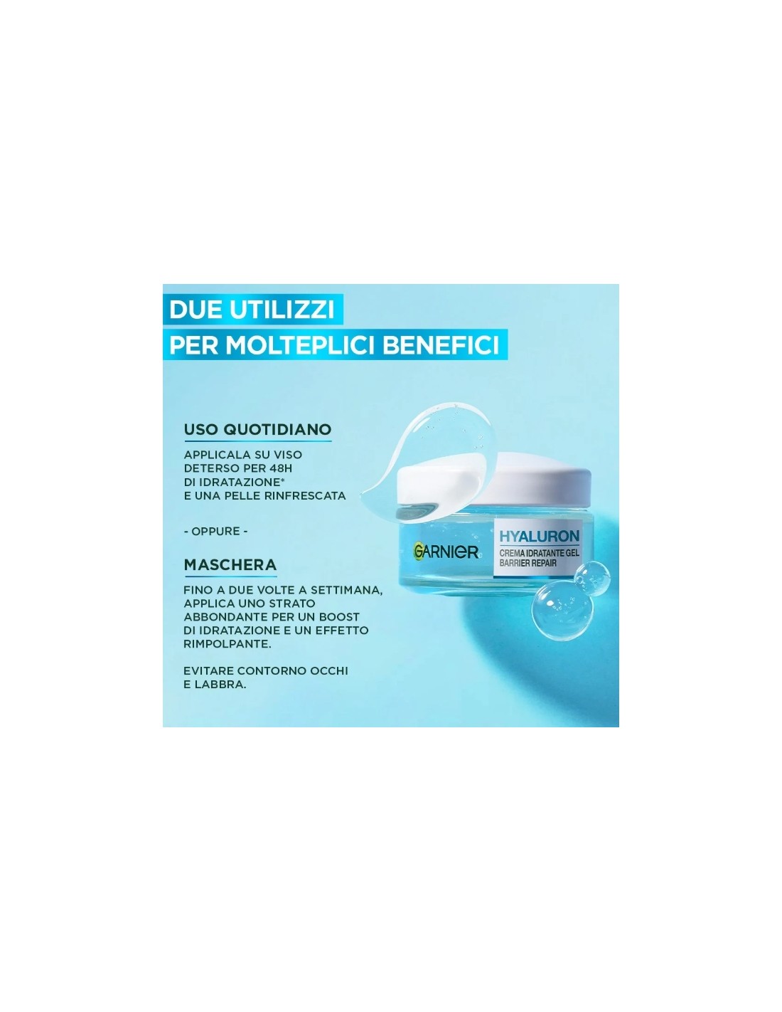 Questa crema ha due utilizzi, per molteplici benefici: PER USO QUOTIDIANO: Applicala su viso deterso per 48h di idratazione e una pelle rinfrescata MASCHERA: Fino a due volte a settimana, applica uno strato abbondante per un boost di idratazione e un effetto rimpolpante. Evitare contorno occhi e labbra.