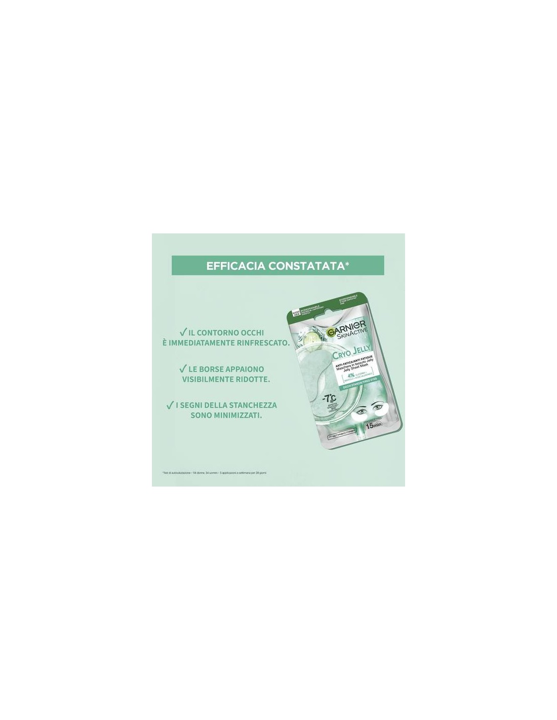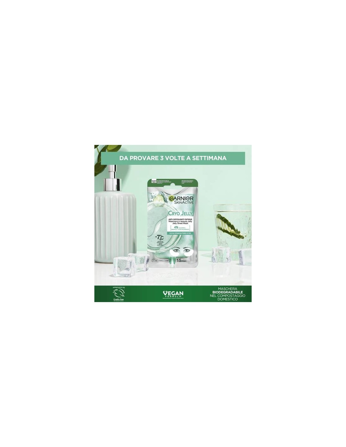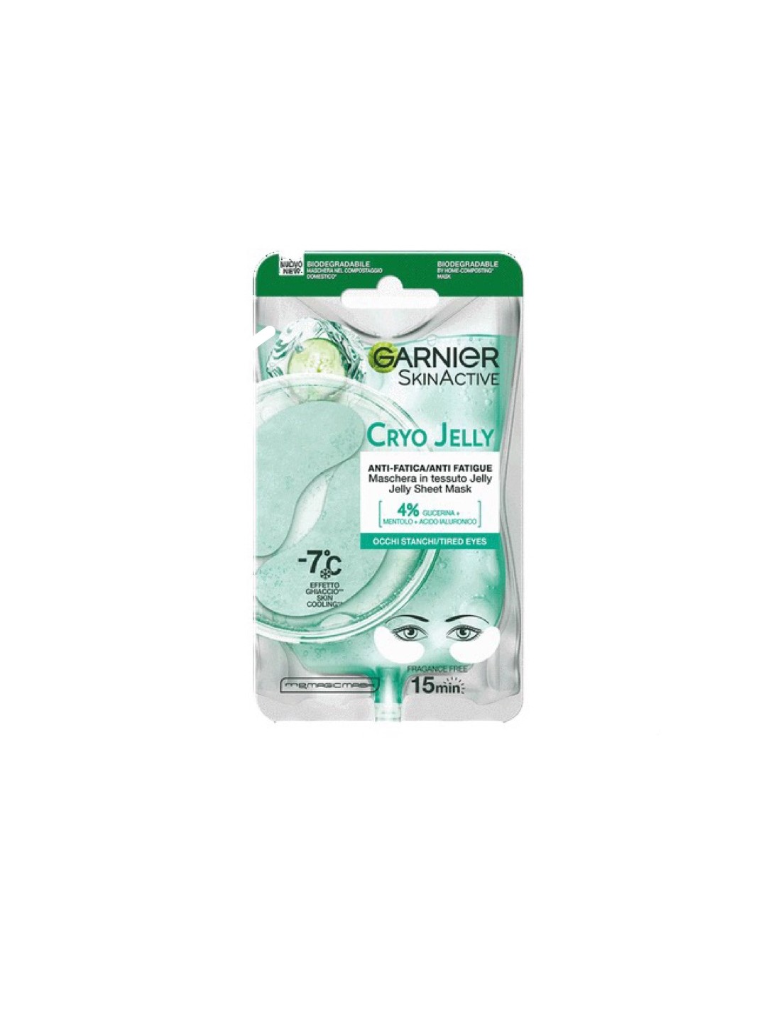Garnier, grazie alla Green Science, ha sviluppato le prime maschere 100% biodegradabili con tecnologia cryo, in grado di risvegliare lo sguardo grazie l'azione rinfrescante immediatata. È composta da un TESSUTO JELLY che lascia la pelle intensamente idratata e da un siero jelly arricchito con glicerina + mentolo + acido ialutronico , che rafforza la barriere cutanea e trattiene l'idratazione nella pelle. EFFICACIA CONSTATATA: La pelle sente immediatamente un senso di freschezza e il viso appare visibilmente riposato. Giorno dopo giorno i segni della stanchezza sono ridotti e la pelle appare visibimente rassodata e distesa.