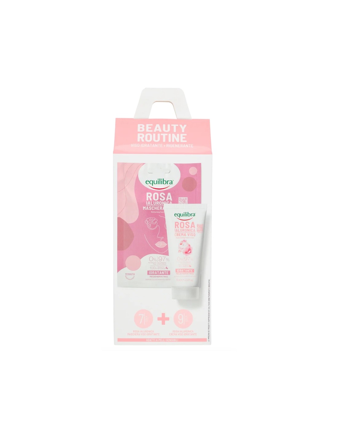 Beauty Routine Viso Rosa Ialuronica contiene: 1 Maschera Viso Idratante, in tessuto 100% naturale (viscosa), studiata per un'efficace azione idratante e 1 Rosa Crema Viso Idratante dalla texture leggera che si assorbe rapidamente senza ungere.