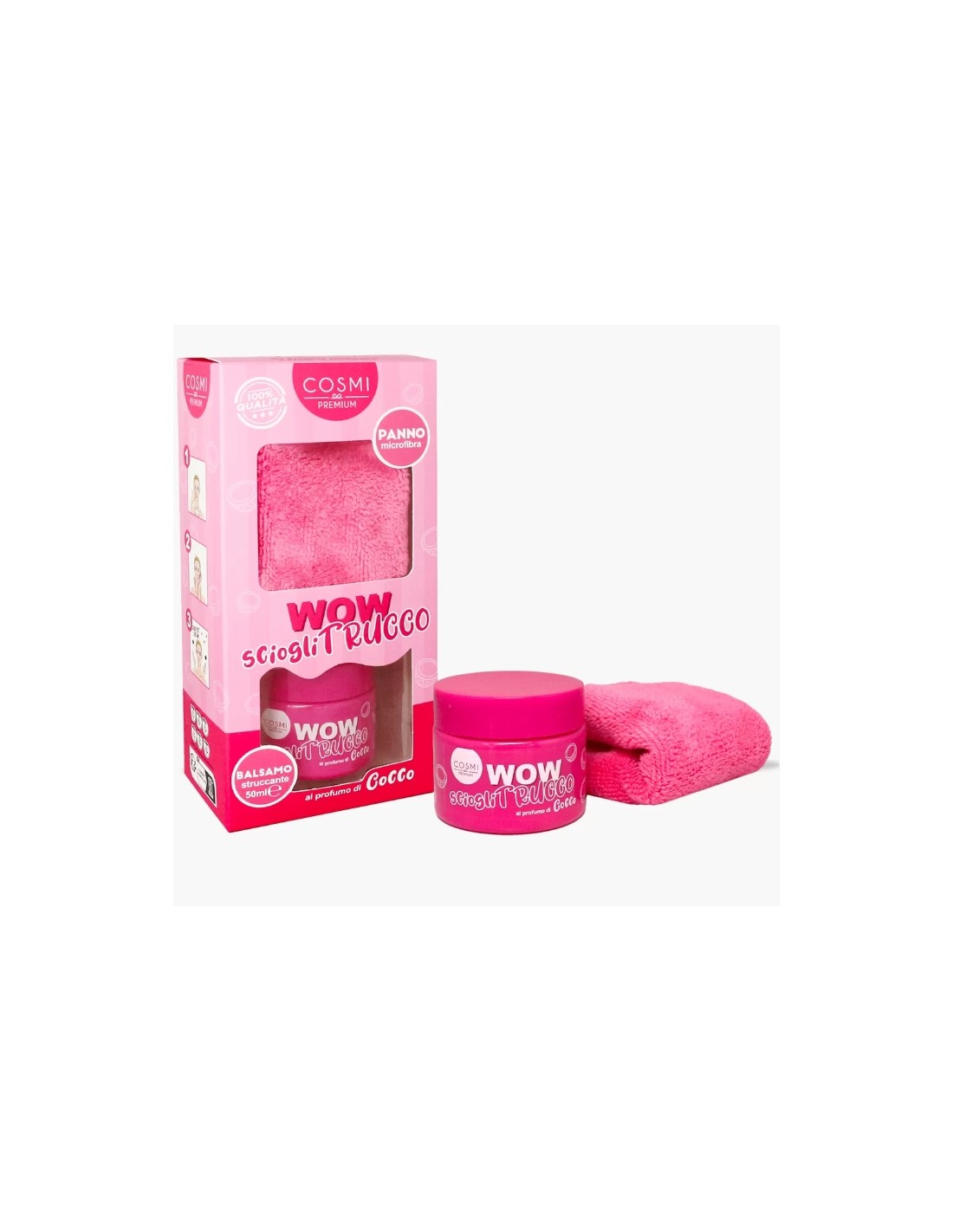 COSMI PREMIUM Wow Sciogli Trucco Burro WOW Scioglitrucco è il set ideale per una rimozione del trucco efficace e piacevole. Questo set include un balsamo struccante al profumo avvolgente di cocco da 50ml e un panno in microfibra per una pulizia delicata. Sperimenta la freschezza e l’idratazione mentre sciogli il trucco con WOW Scioglitrucco.