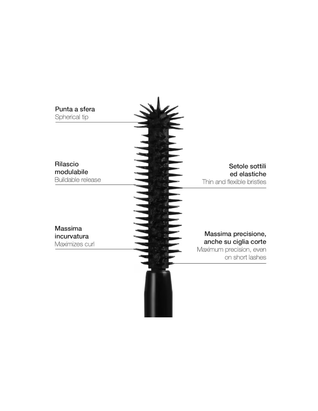 Mascara ad azione 6D: volume, lunghezza, definizione, senza grumi e sbavature, applicazione modulabile per ottenere l'intensità desiderata.