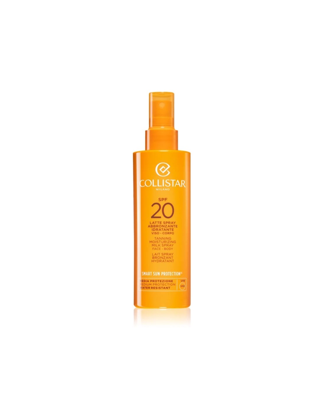 Il latte protettivo in spray SPF 20 Collistar Smart Sun Protection Tanning Moisturizing Milk Spray SPF 20 protegge efficacemente la pelle durante l'esposizione al sole e stimola la pigmentazione con un complesso specifico.